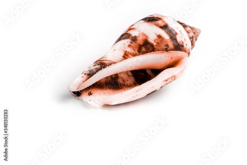 © Maksym, Naklejka premium Shells background. Living Coral pastel color seashell on white backdrop. Hello Summer is coming concept.
