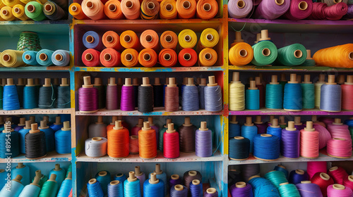 Obraz premium Shelves filled with colorful spools of thread in a fabric store.