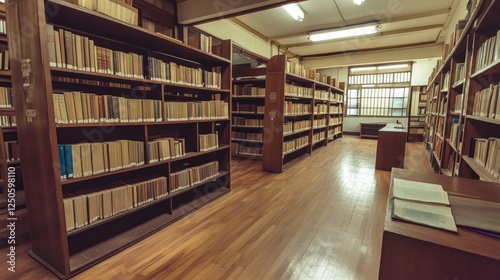 © abdul kahfi, Obraz premium Shelves Full of Books in Classic Library Interior