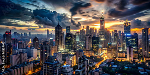 © Joesunt, Fototapeta premium Shenzhen's Golden Hour: A breathtaking panorama captures the vibrant cityscape of Shenzhen, China, as the sun dips below the horizon, painting the sky in hues of gold and purple.