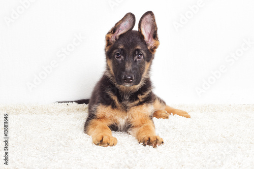 Naklejka premium Shepherd puppy on a fluffy carpet