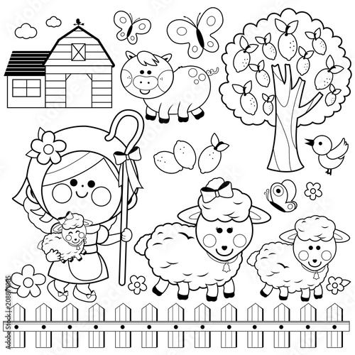© stockakia, Naklejka premium Shepherdess girl and animals at the farm. Vector black and white coloring page.
