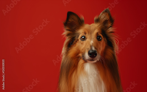 © Darya, Naklejka premium Shetland Sheepdog dog on minimalistic colorful background with Copy Space. Perfect for banners, veterinary ads, pet food promotions, and minimalist designs.