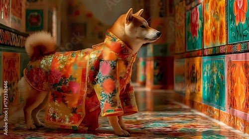 © Khalid, Fototapeta premium Shiba inu in a sparkled formal tunic walking past colorful wall panels in a vibrant decorated space