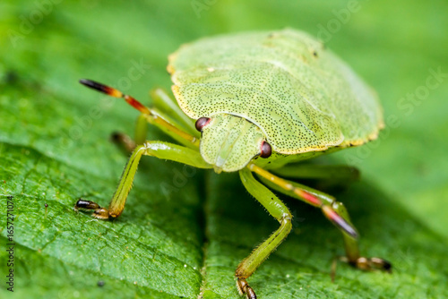 © AlMacro, Naklejka premium shield bug on a green leaf. wildlife. colorful detailed macro photo of an insect. close-up. space for text. screensaver. bokeh