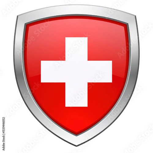 © Purichaya, Fototapeta premium Shield featuring a red background with a white cross symbol, representing Swiss national identity.
