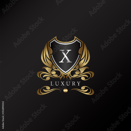 Obraz premium Shield logo in gold color with letter X Logo. Elegant logo vector template made of wide silver alphabet font on shield frame ornate style.