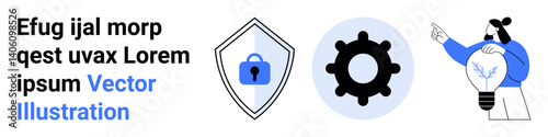 Fototapeta premium Shield with lock for cybersecurity, gear for technology and operation, person with light bulb for innovation, creativity. Ideal for security, innovation, technology, business, teamwork process