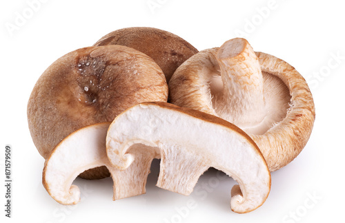 Fototapeta premium Shiitake mushrooms and mushroom pieces isolated on white background. With clipping path.