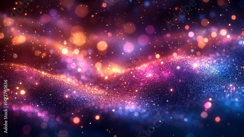 Fototapeta premium Shimmering cosmic flow of blurred bokeh and glittery particles in vibrant,...