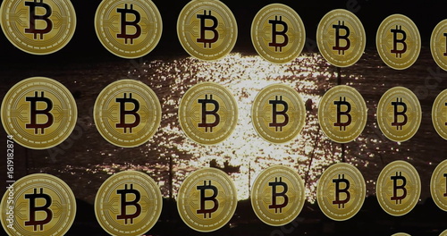 Obraz premium Shimmering golden Bitcoin coin icons floating over rippling water at sunset,...