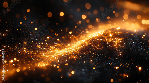 © elabi creative, Fototapeta premium Shimmering golden confetti scattered on dark velvet background