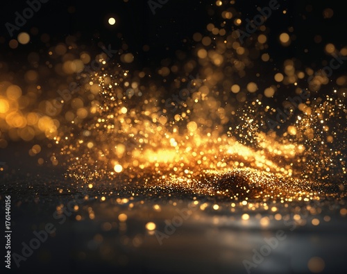 © Gumby, Naklejka premium Shimmering golden glitter particles floating and sparkling against a dark background with a sense of movement and depth, creating a magical and festive atmosphere.
