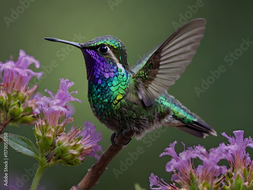 © Yuiziee, Obraz premium Shimmering Hummingbird Hovering Nearby: A shimmering hummingbird with iridescent green and purple feathers perched lightly on a flowering branch, its delicate wings folded in repose.
