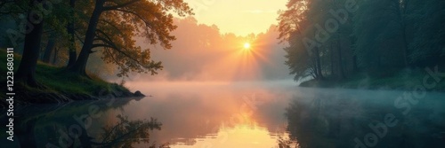 © Anulak, Obraz premium Shimmering water surface reflected in a misty forest at dawn, nature, tranquility