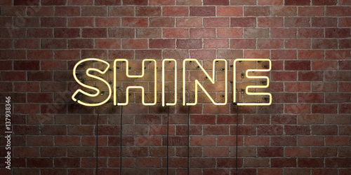 © Chris Titze Imaging, Obraz premium SHINE - fluorescent Neon tube Sign on brickwork - Front view - 3D rendered royalty free stock picture. Can be used for online banner ads and direct mailers..