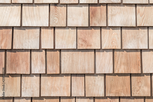 © Chinnapong, Naklejka premium Shingle red cedar wooden shake wood siding row roof panel made of larch conifer tree