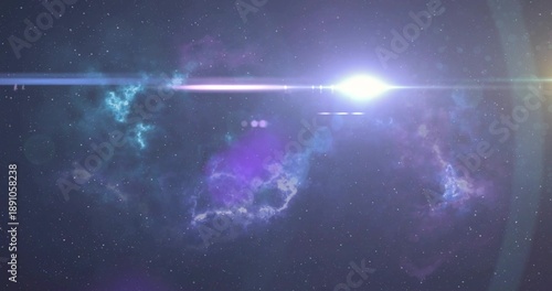 Obraz premium Shining bright stellar source casting horizontal lens flare across deep space, with nebula clouds