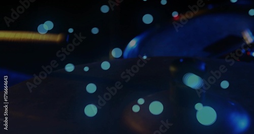 Fototapeta premium Shining metallic drum cymbal reflecting blue bokeh lights at rehearsal area,...