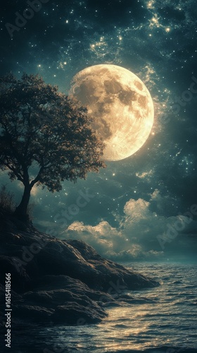 Naklejka premium Shining Moon Over Water with Rocky Shore and Tree at Night
