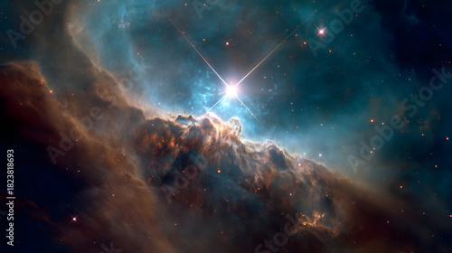 © utaem2022, Obraz premium Shining star illuminating cosmic dust nebula in deep space
