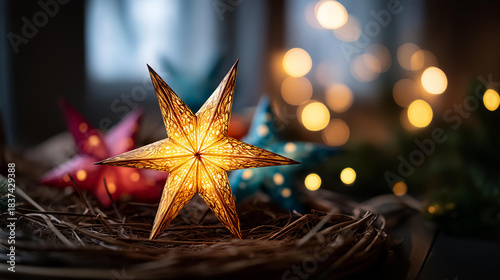 © Kateryna, Obraz premium Shining star over manger christmas nativity scene religious holiday symbolism birth celebration background spiritual winter festivity holy night decoration defocused stable