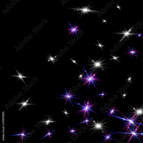 © Serge, Fototapeta premium Shining stars glare on dark background png, sparkling lens light. Beautiful abstract background.
