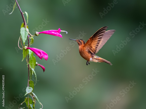 Fototapeta premium Shining Sunbeam Hummingbird Hovering Near Pink Flowers in Andes