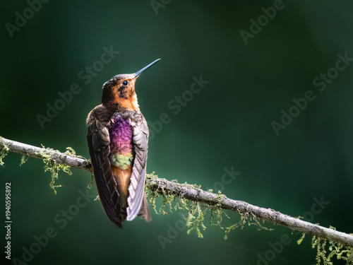 © FotoRequest, Obraz premium Shining Sunbeam Hummingbird Perched on Mossy Branch in Highlands