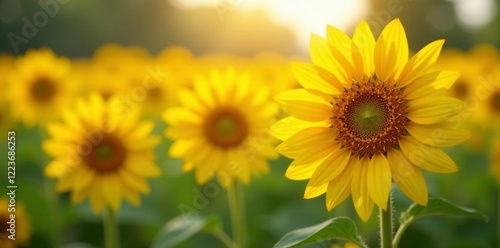 © Anulak, Fototapeta premium Shining sunflowers in a field of heart-shaped wild flowers, bright yellow petals, yellow hues