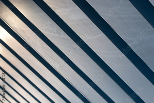 © PeterPike, Obraz premium Shiny abstract large empty gray metal panel striped wall perspective view