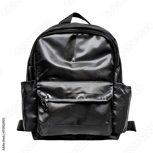Fototapeta premium Shiny black backpack with a front pocket on transparent background