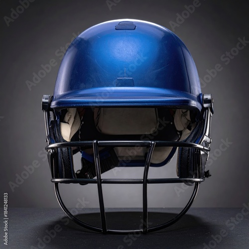 © Ayu, Fototapeta premium Shiny blue helmet with black grill on dark gray background