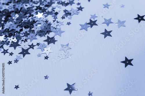 © chalyshevae, Naklejka premium Shiny blue stars for Christmas postcard with space for text, selective focus