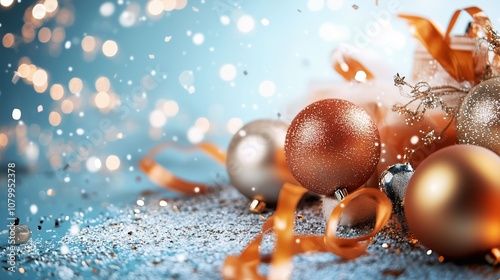 Fototapeta premium Shiny copper and silver ornaments rest on a bed of glitter and ribbon