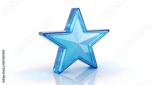 Obraz premium Shiny 3D Blue Glass Star Icon with Glossy Transparent Edges and Reflection on...