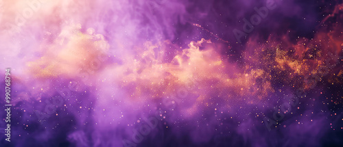 Fototapeta premium Shiny, glowing background with purple swirl of smoke, golden dust, shimmer,...