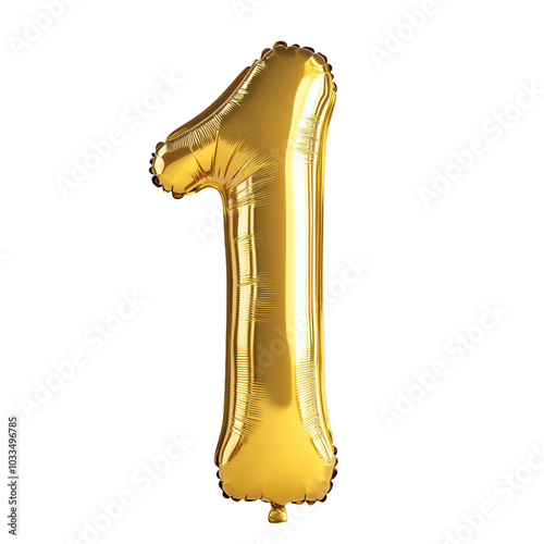 Fototapeta premium Shiny gold number 1 balloon standing upright with reflective surface isolated on a transparent background