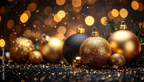Fototapeta premium Shiny golden Christmas balls and baubles for holiday celebration decoration...
