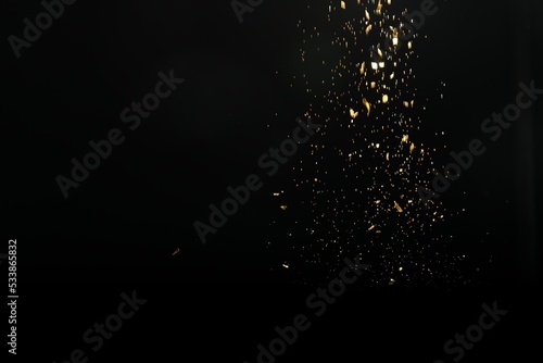 © New Africa, Fototapeta premium Shiny golden glitter falling down on black background. Bokeh effect