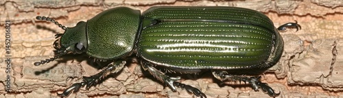 Naklejka premium Shiny green beetle perched on textured wood surface.