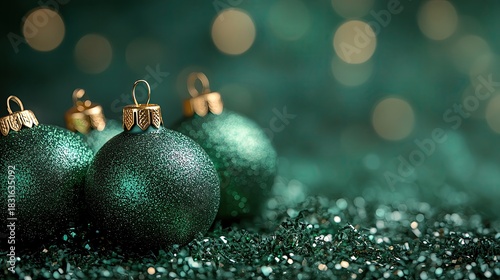 Fototapeta premium Shiny green Christmas ornaments on a festive background