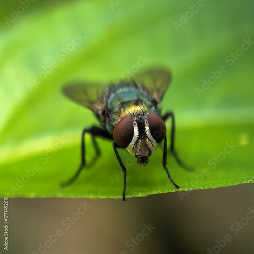 © atar, Naklejka premium Shiny housefly perches on vibrant green leaf