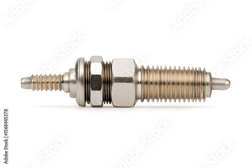 Fototapeta premium Shiny metal bolt with nuts. Hardware for construction and mechanics. Close-up of a fastener on a white background. Precise engineering component.