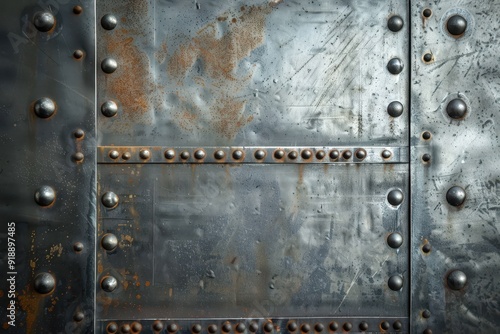 Fototapeta premium Shiny metal plate with rivets on a steel surface