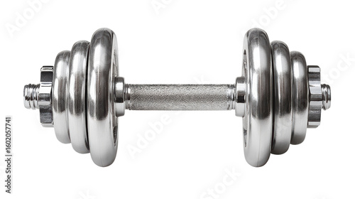 Fototapeta premium Shiny metallic dumbbell on white isolated background for fitness and weight training purposes.