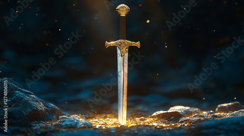 Naklejka premium shiny modern sword standing on rocky ground, symbolizing strength, power, and...