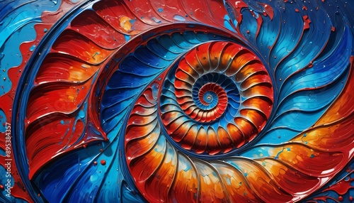 Fototapeta premium Shiny red blue abstract ammonite spiral paint drips