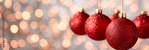 Fototapeta premium Shiny red Christmas balls hanging blurred background with golden bokeh lights classic holiday feel
