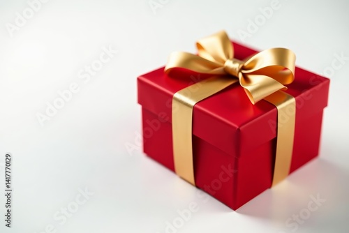 © Teepanun, Fototapeta premium Shiny red gift box with satin gold ribbon on elegant white background, surprise, elegant, festive